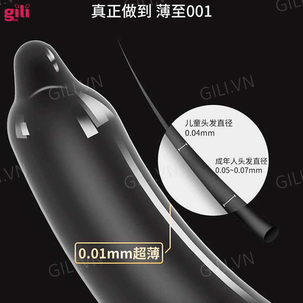 - Đặc điểm: chiều rộng 52mm ± 2mm phù hợp với đa số người Việt. Siêu mỏng chỉ 0.01mm mang lại cảm giác chân thật khi quan hệ. Khả năng truyền nhiệt nhanh.