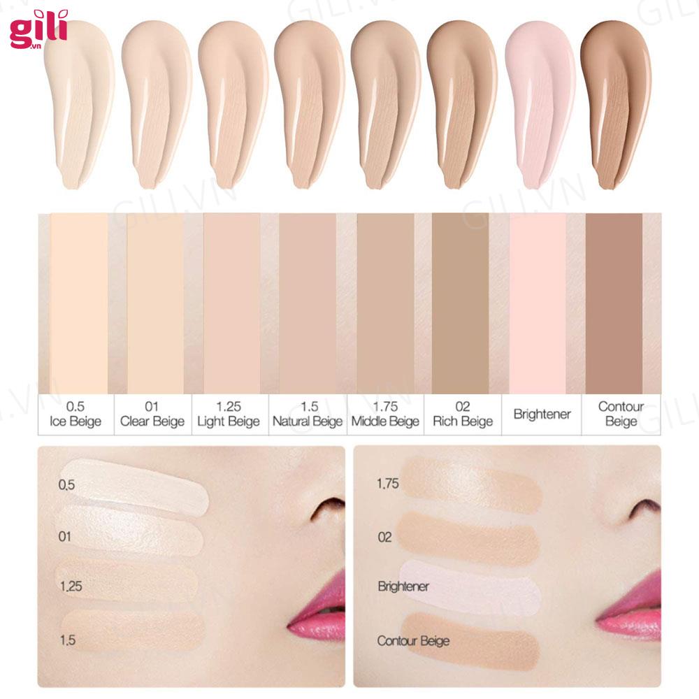 - Đặc điểm: sản phẩm giúp che đi các khuyết điểm nhỏ như quầng thâm mắt, nám, tàn nhang và thâm mụn. Kết cấu dạng lỏng giúp dễ tán đều hơn và để lại lớp nền mịn màng, không vón cục hay gây hằn.