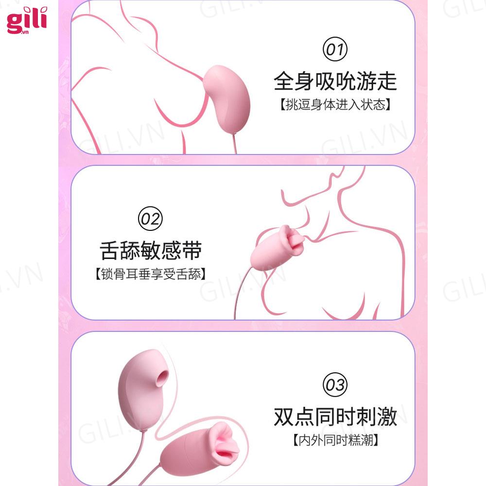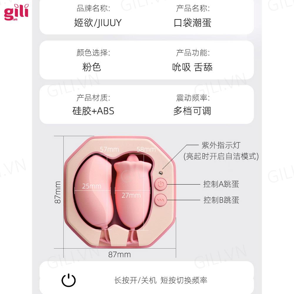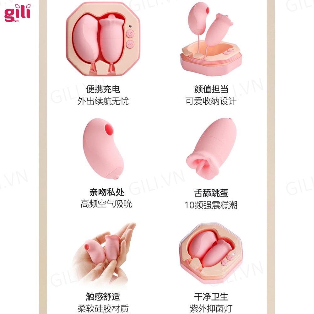 - Đặc điểm: kích thước trứng mút 13mm x 30mm x 55mm có, trứng liếm 27mm x 55mm với thiết kế nhỏ gọn trơn láng có thể mang đi bất cứ nơi đâu. Trứng rung có thể rung đến 10 chế độ khác nhau, chức năng đa dạng nhằm giải toả sinh lý cho bạn. Ngoài ra, còn giúp bạn có màn dạo đầu đầy kích thích và thăng hoa hơn tạo cảm giác mới lạ khi yêu. Chế độ rung đa tần có điều khiển. Chất liệu nhựa ABS + Silicon chống nước không độc hại an toàn cho da không sợ bị kích ứng, dù da bạn có nhạy cảm cũng hoàn toàn yên tâm, thời gian sử dụng lên đến 4 tiếng.